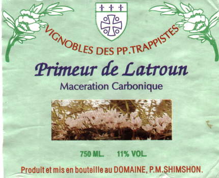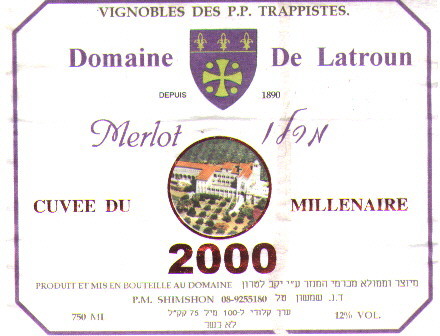 DOMAINE DE LATROUN The abbay of Latroun stands 35 km from Tel-Aviv, a few hundred meters away from the highway Tel-Aviv - Jerusalem. Since the end of the XIXth century, the trappist monks produce there wine with an evident french influence. I personnaly enjoy particularly their Gewurztraminer and their Rosé, the only dry blush wine I find in Israel, a must for the hot summer which costs a modest $ 4 for a bottle. At a certain period of the year, the primeur is available and reminds well the "Beaujolais nouveau". The abbay also produces from time to time special "cuvées" dedicated to various themes, an opportunity for a label collector. As a conclusion, when I'm travelling between Tel-Aviv and Jerusalem, I always have a good reason to stop at Latroun, without too much fear for my budget. |